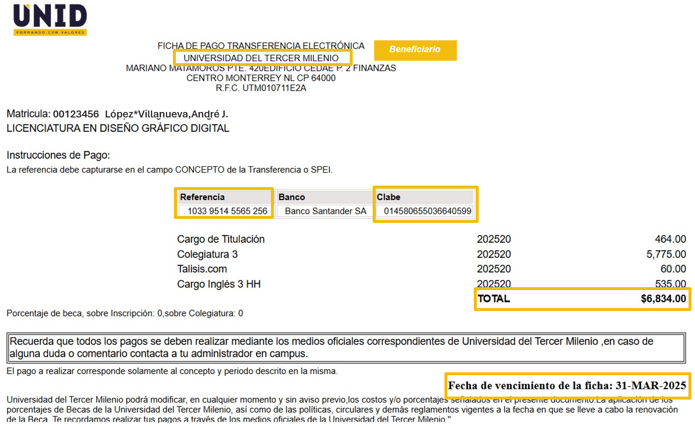Ingresa a la aplicación de tu institución bancaria. Da de alta la cuenta de UNID en tu portal bancario. El destinatario será la CLABE que aparece en la ficha de pago, además que el Beneficiario será el nombre de la institución: "UNIVERSIDAD DEL TERCER MILENIO S.C.". En caso de que el banco de origen y destinatario sea el mismo, el campo de Beneficiario/Nombre y Alias se autocompletará.