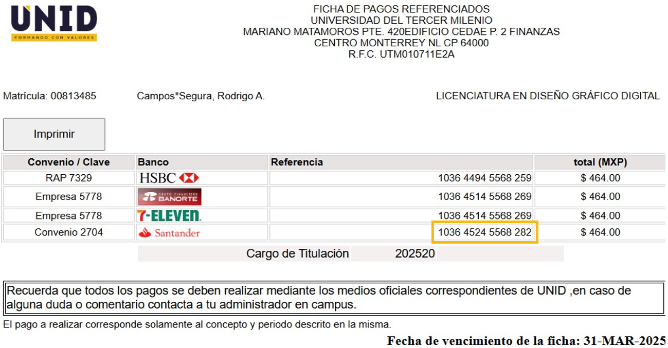 Se abrirá una ventana de la ficha de pago. En la ficha se encontrará el nombre de la institución (Beneficiario), la referencia bancaria (Concepto), la CLABE de la institución bancaria, la cifra a pagar y la fecha de vencimiento de la ficha de pago.