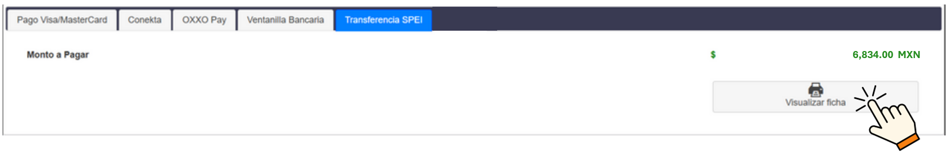 Para realizar el pago, selecciona la pestaña Transferencia SPEI, después genera la ficha de pago por medio del botón Visualizar Ficha, así se podrá imprimir o tomar captura de la imagen para realizar la operación en tu portal bancario.