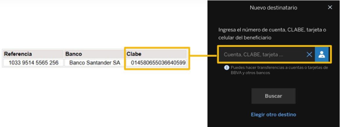 En el campo de Tarjeta/Cuenta/CLABE del destinatario ingresa la CLABE que se ve en la ficha de pago.