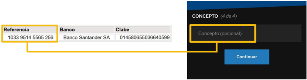 El campo Concepto/ Motivo debe de escribirse la Referencia que se proporcionó en la ficha de pago para el banco destinatario.