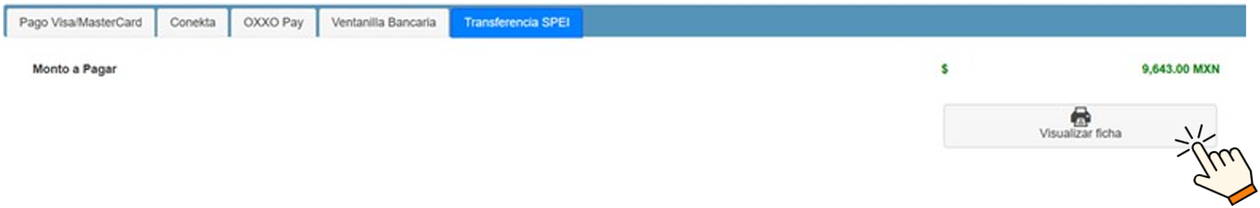 Para realizar el pago, selecciona la pestaña Transferencia SPEI, después genera la ficha de pago por medio del botón Visualizar Ficha, así se podrá imprimir o tomar captura de la imagen para realizar la operación en tu portal bancario.