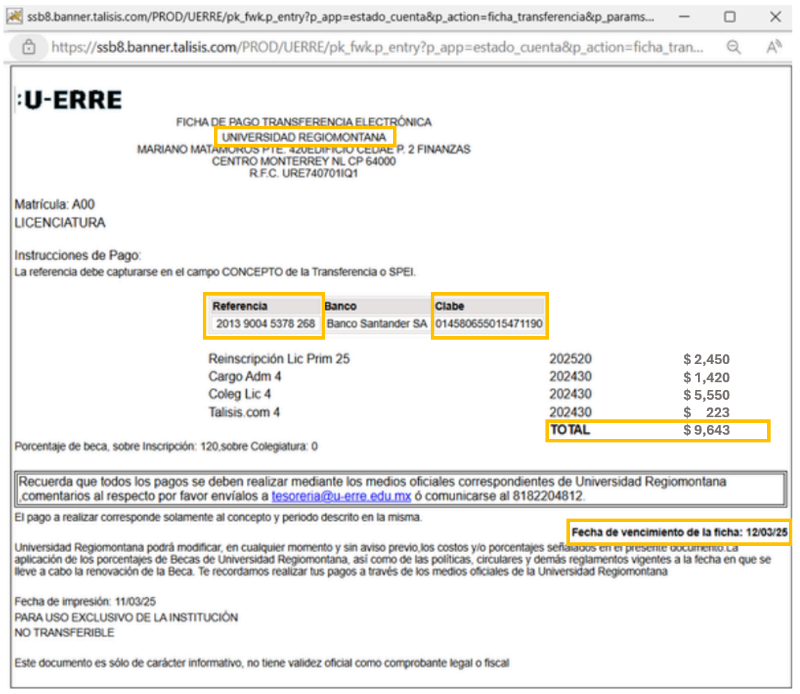 Se abrirá una ventana de la ficha de pago. En la ficha se encontrará el nombre de la institución (Beneficiario), la referencia bancaria, la Clabe de la institución bancaria, la cifra a pagar y la fecha de vencimiento de la ficha de pago.