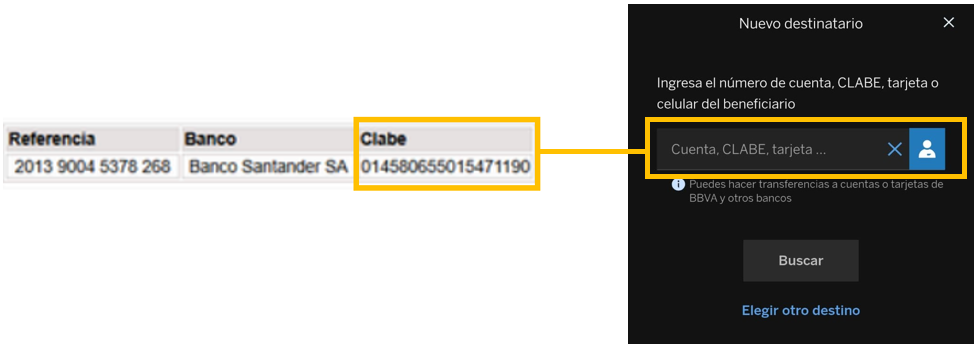 En la sección de Tarjeta/Cuenta/CLABE del destinatario ingresa la CLABE que se ve en la ficha de pago.