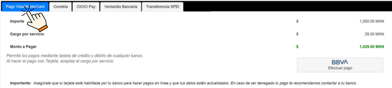 - Selecciona la pestaña Pago Visa/MasterCard, luego da clic en Efectuar Pago.