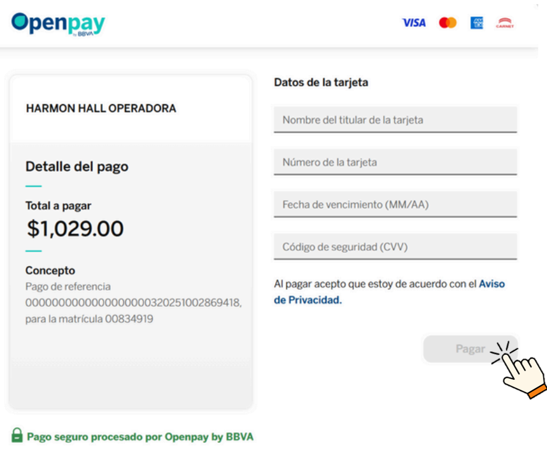 - Se abrirá una ventana en la que tendrás que agregar la información de tu tarjeta. Una vez capturada, selecciona Pagar.