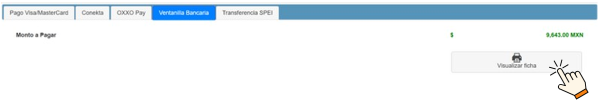 - Para realizar el pago, selecciona la pestaña Ventanilla Bancaria y genera tu ficha de pago en donde se podrá imprimir o tomar captura de pantalla, por medio del botón Visualizar Ficha.