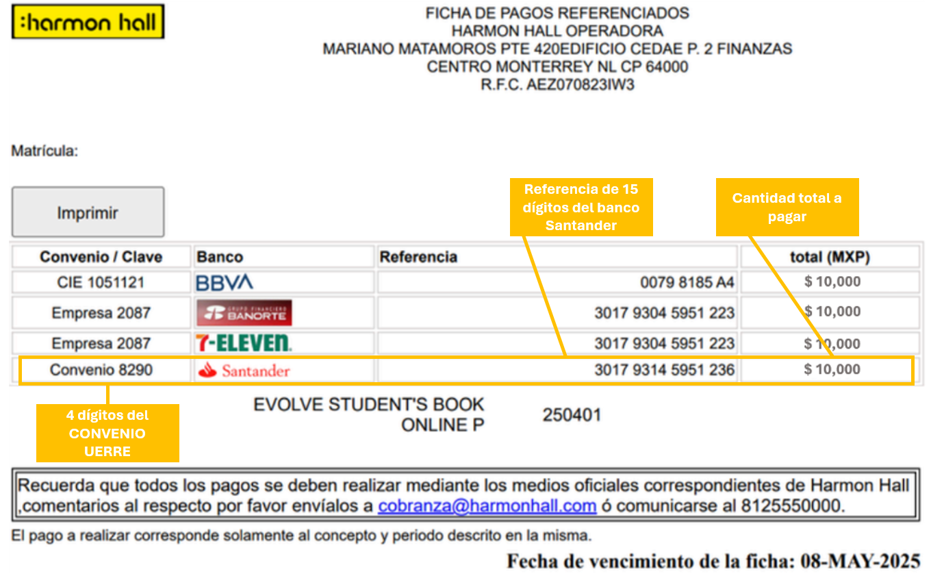 En el campo Convenio, anotar los cuatro dígitos que aparecen en la Clave del Banco Santander que se encuentra en tu ficha.